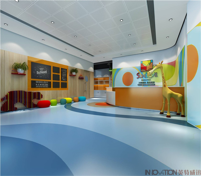 進入大廳,首先映入眼簾的是入口門廳和logo墻,設計中大膽使用色彩鮮明的跳躍性線條,更好的體現個性化教學的特色。