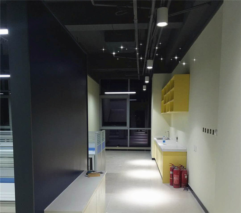 亮點1:辦公區吊頂應用原頂灰色環保漆料噴涂, 顏色簡潔大方,給人以沉穩的視覺感官效應,其吊頂優點是節約成本,便于維修。