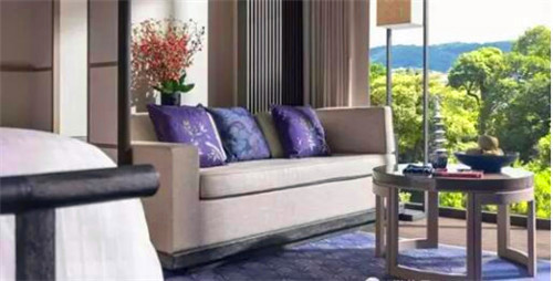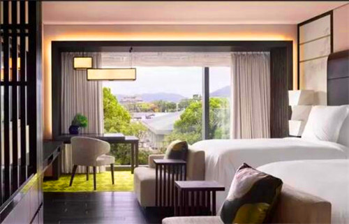 京都四季酒店共有110間客房,客房內洋溢著寧靜私密的氛圍,設計上體現出傳統和室的特色。日光在簡譜的木地板上投下鮮明的影子,屏風上也繪著當地藝術家的作品。還有以明亮的紫色為主調,采用天然橡木地板的客房設計,盡顯皇室風范。多數房間可以擁有日本庭院的室外風景,陽光穿透樹枝從落地窗灑進房內,水光粼粼的庭院更一覽無遺。HBA新加坡設計團隊還巧妙地將池泉園、妙法寺及周邊的美景納入房間窗景中。透過窗戶便是一副四季如畫的風景線。