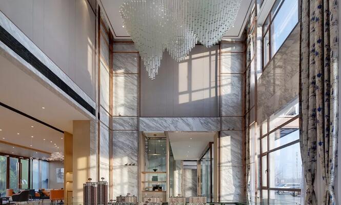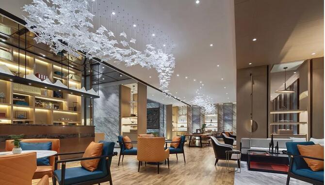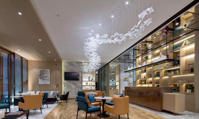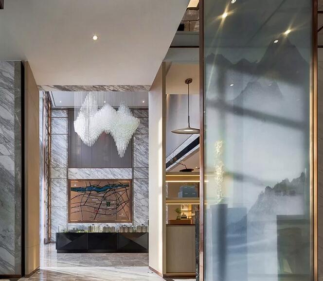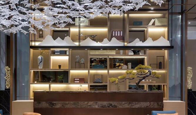 “夫畫道之中,水墨最為上。肇自然之性,成造化之功。”雕塑“墨舞”以濾盡色彩剔透琉璃為墨,飽蘸筆觸,起承轉合,縱橫貫穿于洽談區,成了空間最純粹的風景。