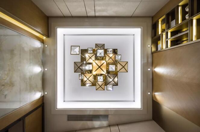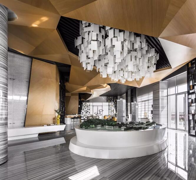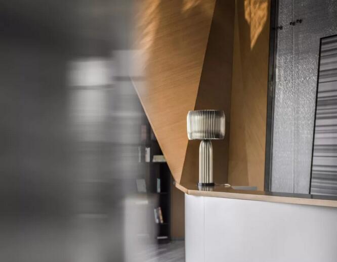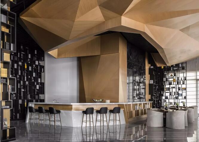 沙盤區(qū)的吊燈擯棄了傳統的吊燈形式,而采用了幾何陣列的形式感,在突出其設計美感的同時,也在和空間的內在結構產生關聯。運用黑白的對比和幾何的構成感,彰顯出不一樣的藝術張力。