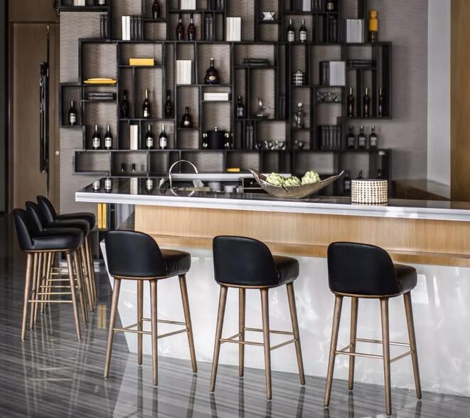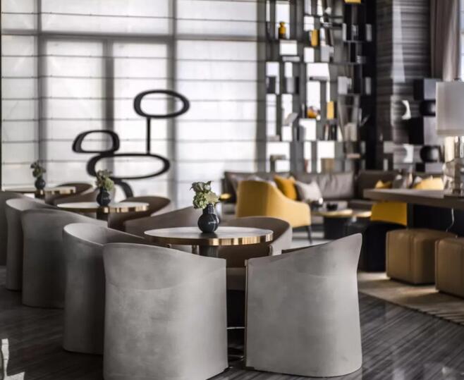 水吧區(qū)作為緩沖空間,黑色的面料延續(xù)著空間的重色,呼應著硬裝的基礎色彩。在視覺上呈直線的形式向一個方向延展開來。