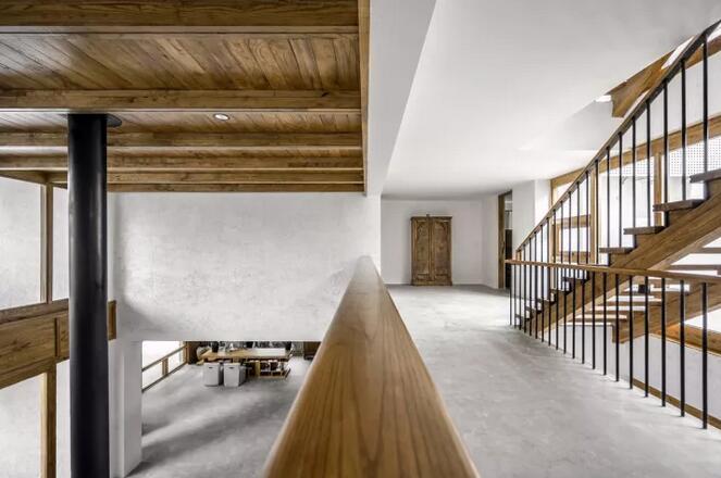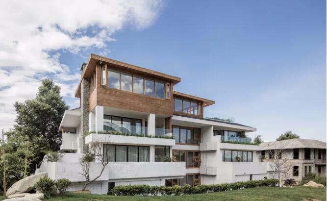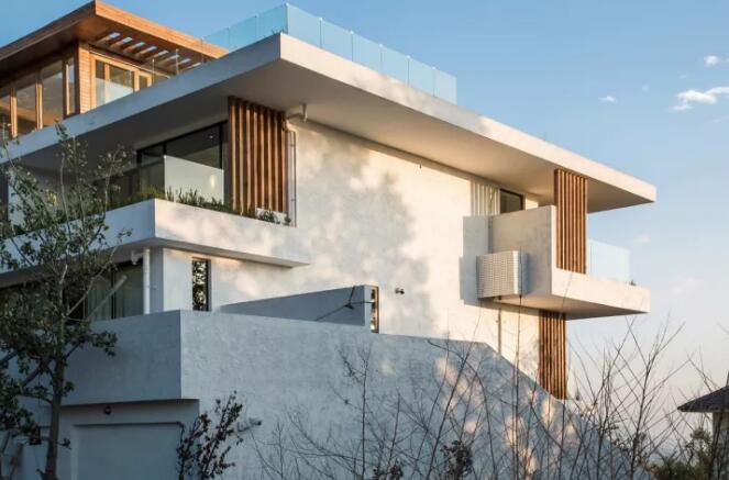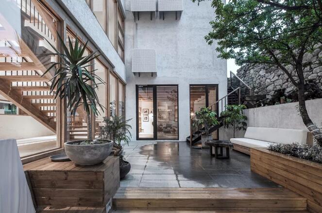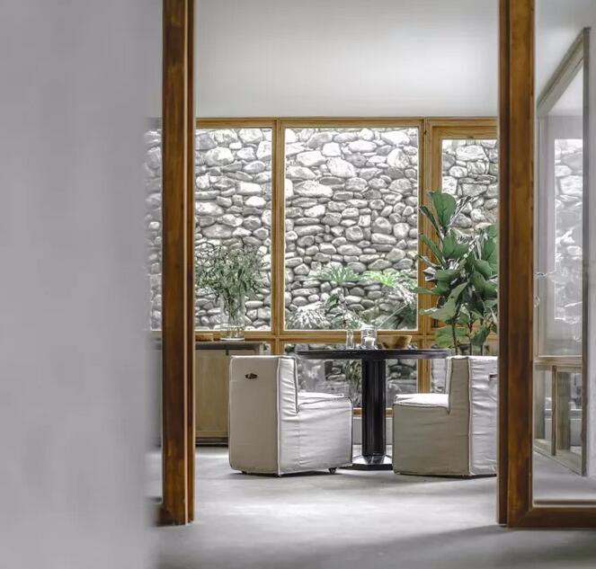 拾山房在材料的運(yùn)用上也秉持著低調(diào)的特點(diǎn)。主體是略帶粗糲的清水混凝土,配以木格柵和木質(zhì)的窗框,頂層則是以木為主,與自然更為相融。首層院落則有山石堆砌的圍墻,從坡地里長(zhǎng)出。整體用色也非常克制,在這山水之中絲毫不顯突兀。