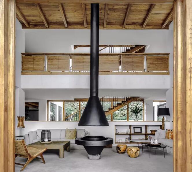 入口位于建筑東北角,并不十分起眼,由路面下幾個(gè)臺(tái)階,正對(duì)著的是側(cè)院里的鏡面水池,池中植一棵高大有年份的花紅果樹。拐過入口門廊,進(jìn)入接待廳,以一種較為婉轉(zhuǎn)的方式開始空間體驗(yàn)。承接入口空間的是位于中心的大廳,兩層通高,形成整個(gè)首層的核心空間。巨大的上懸式壁爐掛在大廳的中心,強(qiáng)化了空間的核心感,其他的公共空間皆圍繞其展開。
