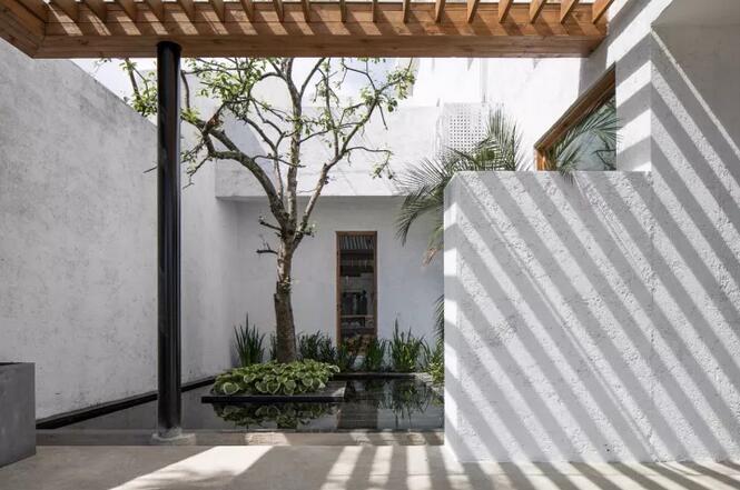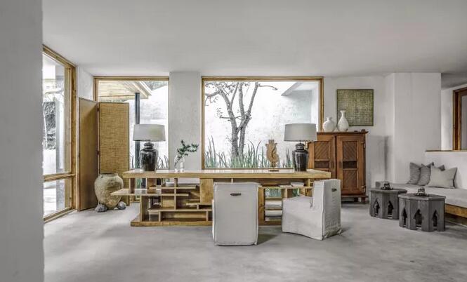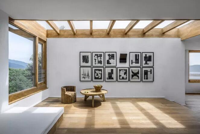 天氣晴好的時(shí)候大理的陽(yáng)光非常干凈純粹,因此光在大理對(duì)于建筑的空間是非常重要的因素。拾山房?jī)?nèi)的許多空間都有對(duì)光的設(shè)計(jì),巧妙利用陽(yáng)光在室內(nèi)形成極其動(dòng)人的光影變化。頂層的四面玻璃以及天窗,每間客房?jī)?nèi)面向露臺(tái)的落地窗,都是對(duì)陽(yáng)光最好的呼應(yīng)。而室內(nèi)設(shè)計(jì)在物件陳設(shè)的設(shè)計(jì)上也非常細(xì)致地考慮了光影的影響,木柜、陶罐和掛飾的幾何關(guān)系在光影下顯得格外好看,因此每一個(gè)角落的細(xì)節(jié)都經(jīng)得起推敲。