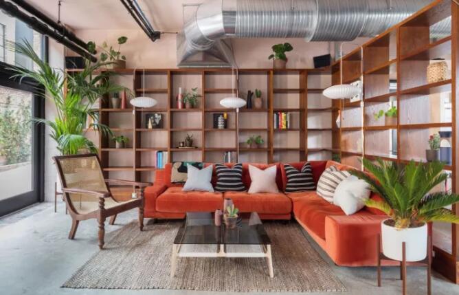 會客區(qū)中長條狀木制桌子搭配20世紀早期的戶外椅、網(wǎng)格狀書柜,整體氛圍尤其適合辦公。一部筆記本、一杯拿鐵和一本雜志值得沙發(fā)中沉溺一天。 石膏粉紅色的磚砌,光滑的混凝土地板,清新的色調和多層次的綠色,是現(xiàn)代主義與洛杉磯街頭風交融的最佳呈現(xiàn)。