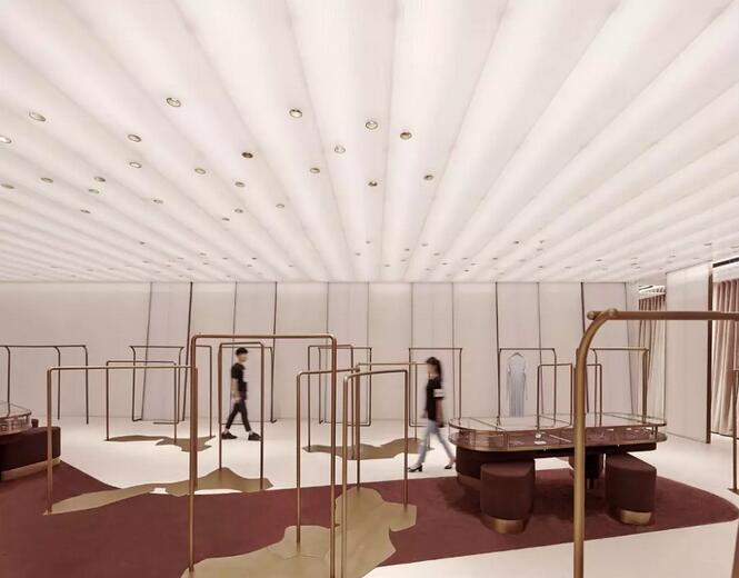 整個空間演變為一個充滿原始氣息的營地,北京裝賣店設計從入口出的手工編織物,到其后粗糲的不規則石墩,金屬的支架如同榕樹枝椏般的枝蔓,與從頂上懸掛的用暗紅麂皮絨包裹的“長辮子“燈具用吸鐵石固定相互支撐,可隨意扭動改變形態。北京專賣店設計吊頂采用16米長陽光板拼裝,陽光板透出上層的環境光,近似彌漫的朦朧天光,營造出部落群居場所的氣息。