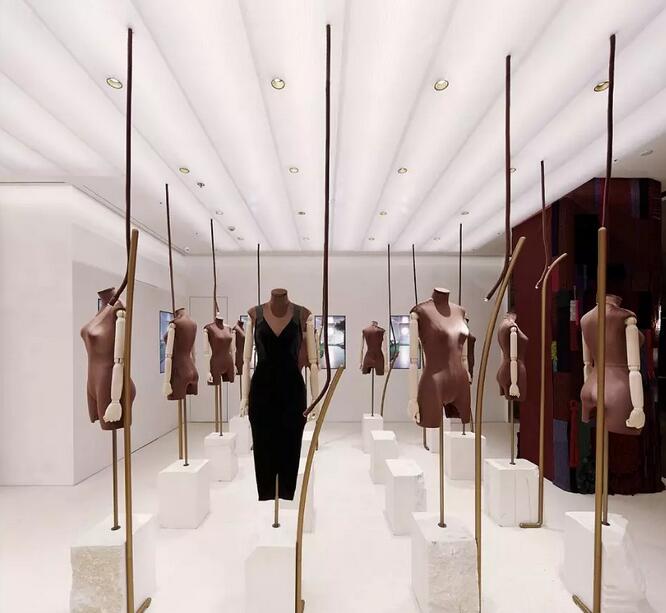 野營的中心是弧形條狀的領地,兩張8米長的首飾臺,用可旋轉座椅替代桌子的豎向支撐,北京專賣店設計這里是野營的活動中心。周圍著的是二三一組的獨立的金屬衣架,底部圖形可隨意拼接,北京專賣店設計模擬營地中大片葉子簇擁在一起的輪廓,頂上陽光板吊頂上的點光源的分布與地面水磨石的骨料變化范圍相對應,與衣架的組團相呼應,烘托出“領地“感。 北京專賣店設計入口大柱子上手工編織物來自和waa合作的一位藝術家之手,暗紅色調一直延續到更深處,化作泥濘的土地。