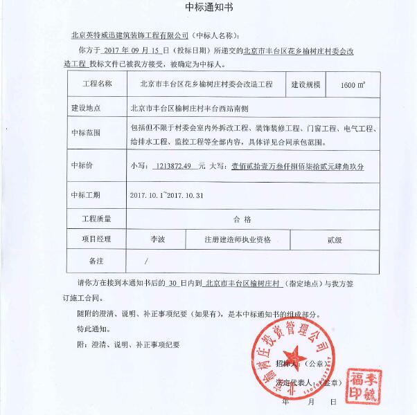 北京英特威迅建筑裝飾工程有限公司于2017年09月15日所遞交的北京市豐臺區花鄉榆樹莊村委會改造工程投標文件已被我方接受,被確定為中標人。