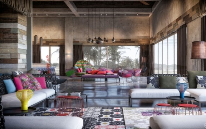 大廳是開放式的空間,用十分有活力的顏色和天然的紋理搭配橫縱向充斥著空間內,使得其十分舒適。大廳的墻上有12張圖,這些藝術品的顏色是對大廳其余部分的沉思,展示在墊子、花瓶、家具和地毯上。
