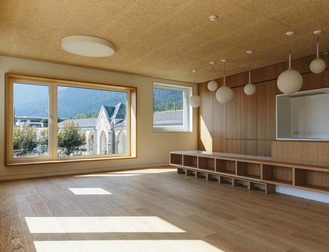 所有房間組成了一個和諧連續(xù)的空間,適宜兒童尺度的趣味景觀設(shè)計使孩子們可以欣賞室內(nèi)或室外多彩多樣的迷人風景,橫向和縱向的開窗更豐富了這種體驗。