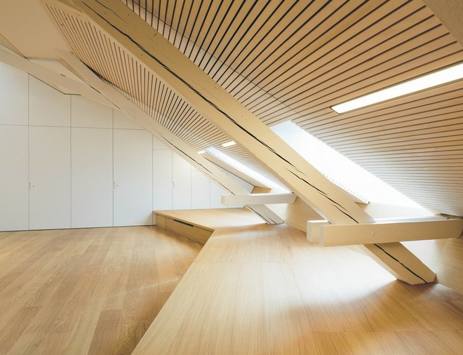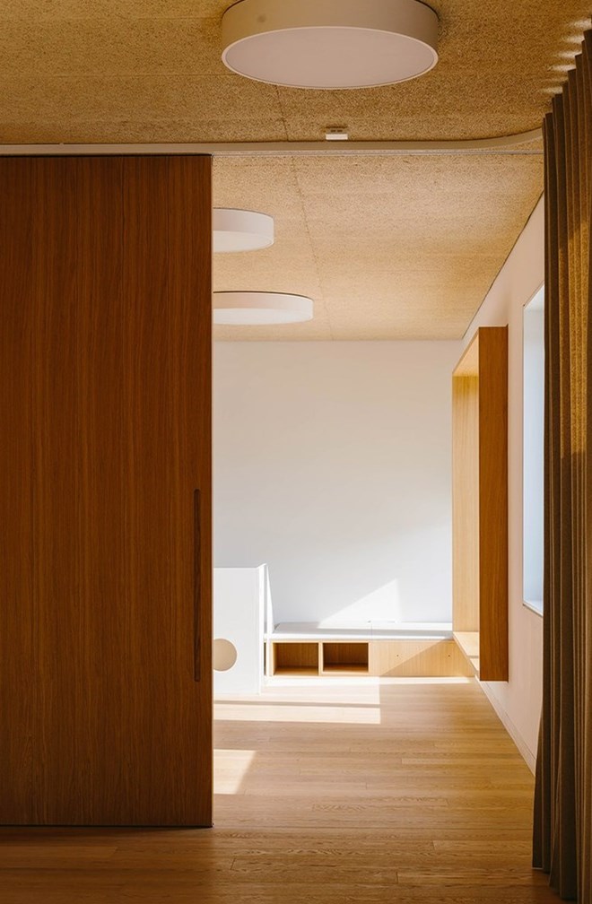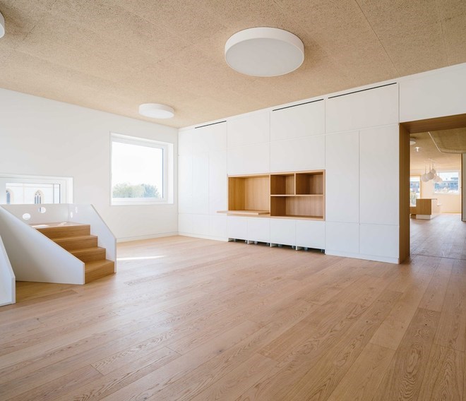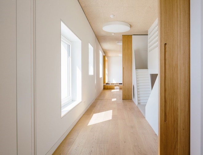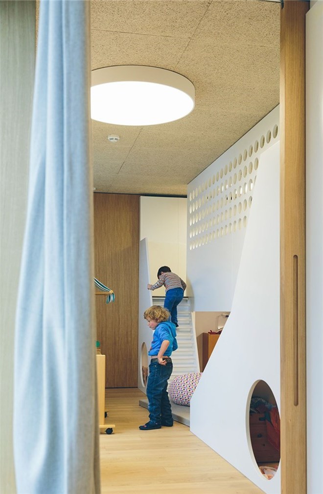 樓梯直接通往公共用餐區(qū),它與八組兒童房間相連組成了一個巨大的共享空間。孩子在這里學習娛樂,所有空間都均質(zhì)排布。建筑師設(shè)計了大量的被動式節(jié)能屋。