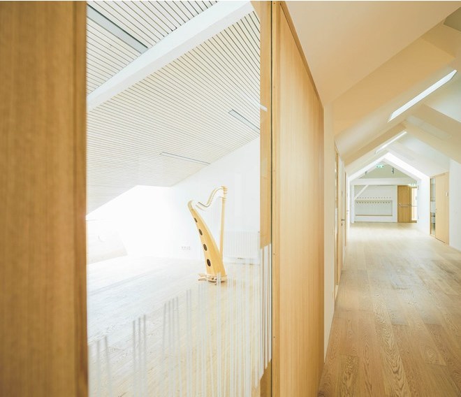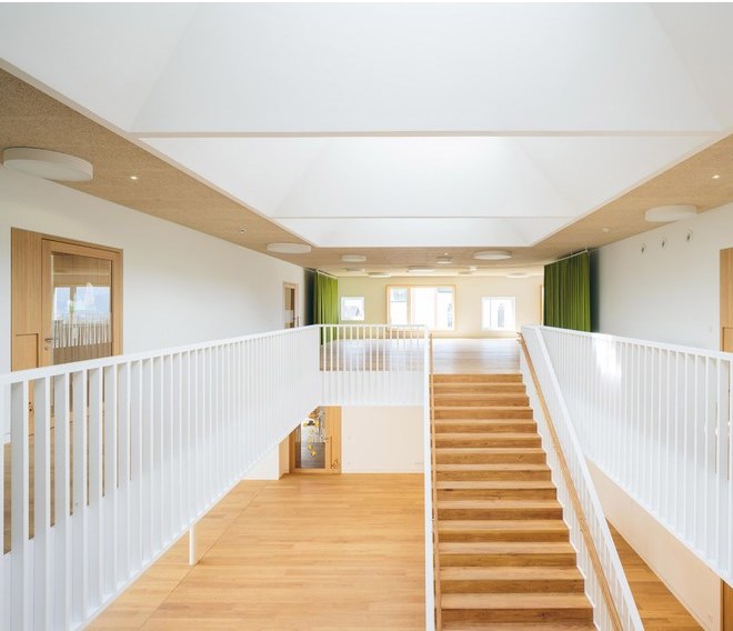幼兒園的核心是其交通空間,寬敞的樓梯被一個畫廊環(huán)繞,雨傘狀的錐形天窗提供了人工和自然光。
