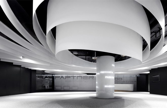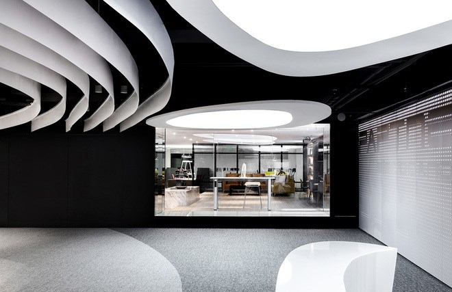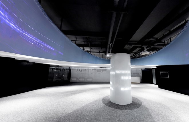 智能化燈光變幻,環繞式視頻投影,加強了空間的未來感與科技感。這里既是前臺區也是展覽空間。減去多余的裝飾,在設計上,峻佳化繁為簡,創造一個純粹神秘的空間,展示著一個品牌的未來想象力。辦公室與展廳的多重變奏,空間既要獨立而連貫又互不干擾,由超前未來區到專業辦公功能展示區,這是設計的一次變奏。