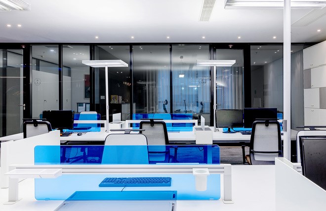 別致的會議室宛如飛船艙室,透明材質營造空間的通透感。動線布局則是室內設計的關鍵,隔而不斷,移步換景。考慮到使用的便利性,將其置中于員工區,平衡了功能使用與場景亮點。在設計中,色彩、裝飾等不同元素產生多樣化的審美體驗。經驗豐富的設計師擅長用顏色帶領情緒。過渡區鮮艷的色彩令人愉悅充滿靈感,白色和藍色的搭配則顯得簡潔明凈,讓人能夠安心思考。設計、空間與家具之間的相互搭配,是辦公室設計的關鍵。