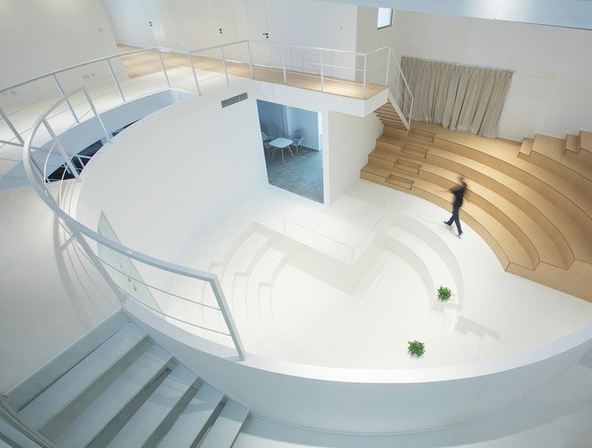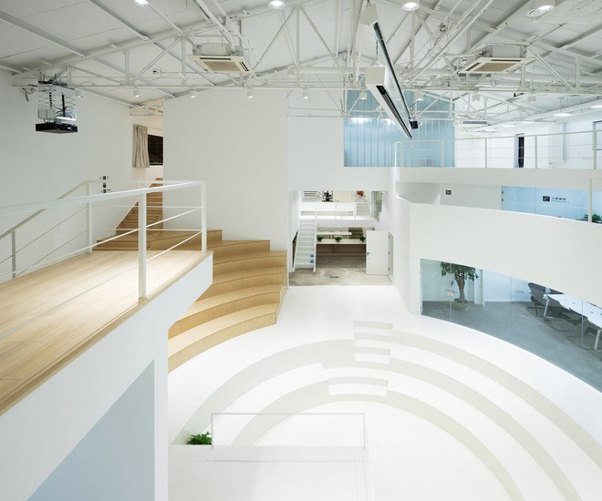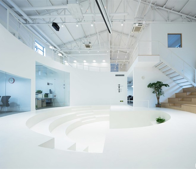 中庭的圓形廣場靈感來源于電影里經(jīng)典場景土樓的空間特質(zhì),保留原始層高的通高空間作為整個設(shè)計核心交流場所,從空間設(shè)計上塑造一種強烈的集體歸屬感。廣場的四分之三部分作圓形下沉,成為街角式的階梯小劇院,以及提供討論,看電影等一系列公共交往功能。廣場周圍圍繞一圈工作區(qū),包括封閉、半開放辦公室,以及創(chuàng)始人的辦公空間。