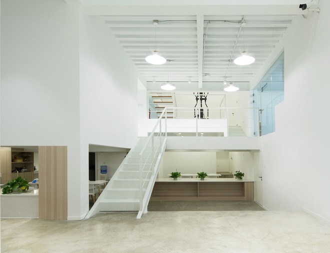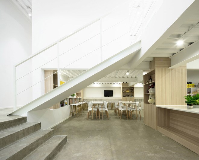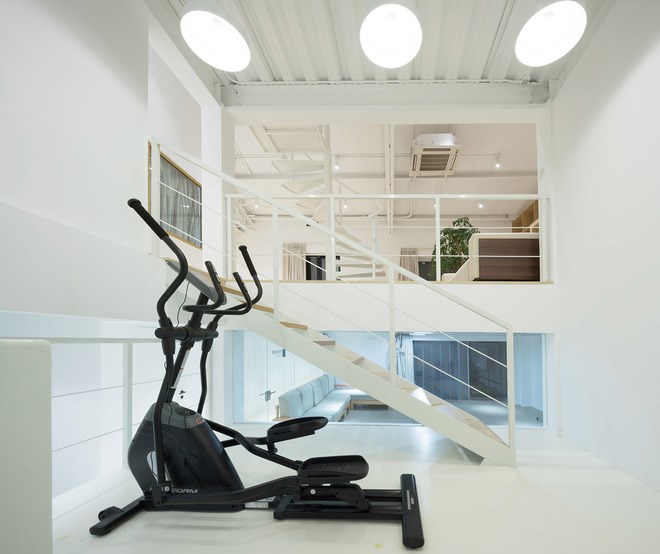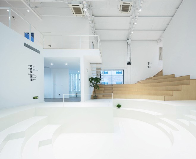 整個設(shè)計在保留長方形廠房的基礎(chǔ)上,建筑室內(nèi)空間輪廓放棄了長方形的限制,建筑室內(nèi)標(biāo)高也不再是單一水平,而是功能的分化設(shè)置不同區(qū)域的標(biāo)高,通過室內(nèi)階梯與坡道相互連接。廠房東邊做了兩層標(biāo)高,一層入口區(qū)為形象宣傳,臨近南立面是一個長廊,一半作為電影海報展示,另外一半為微縮景觀。外墻鏤空花磚形式,陽光透過外墻照射到展示長廊。二層為獨立創(chuàng)作空間與兩個創(chuàng)始人工作室。廠房西邊利用層高做了多個標(biāo)高,從一至四層以及之間的夾層與錯層空間,容納了開敞通透的圖書室,封閉的觀影室,健身房、淋浴室、半地下(負一米)廚房、聚餐和party空間,也有加班可以休息的睡眠空間。