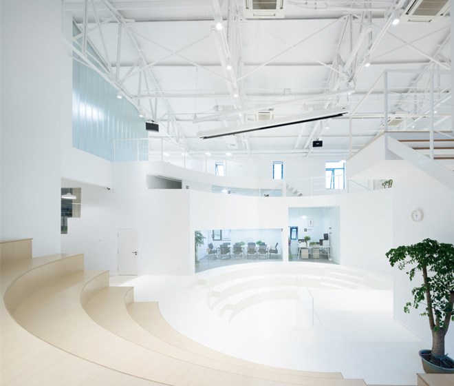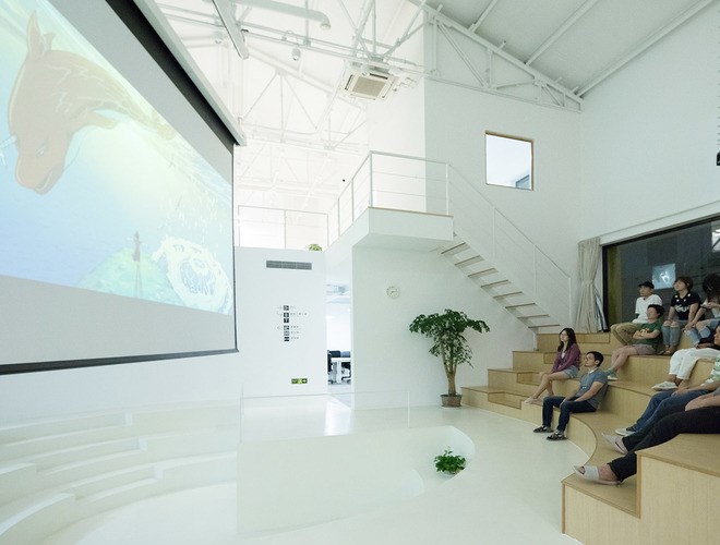 動畫片制作特殊的工作流程,分為前期中期后期三部分。前期制作需要相對自由的氛圍,能帶動創(chuàng)新思考的舒適空間。中期制作作為工作主體,對空間的靈活性和開闊性較有要求。而后期制作則要求嚴格控制光線進入空間內(nèi)部。彼岸天團隊由創(chuàng)業(yè),發(fā)展到現(xiàn)在形成以年輕人為主的一個大家庭氛圍,有自己的廚師,員工晚上有時會加班睡在工作室里。根據(jù)這三個不同工作目標(biāo)的團體的需求,建筑師在這個空曠的方盒子內(nèi)進行重新規(guī)劃,在整個大的空間里面限定出眾多圍和與半圍和的室內(nèi)空間,以滿足不同的使用需求。