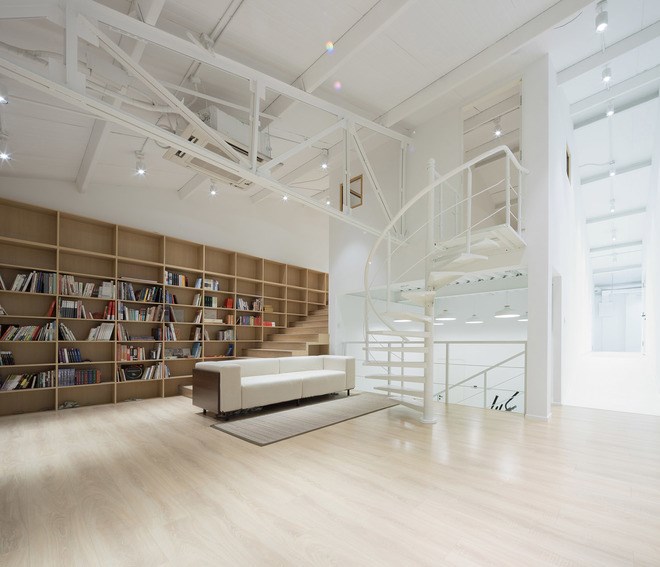 整個廠房建筑層高利用達到極致,并且外立面開窗和室內(nèi)功能相互對應(yīng)。整個立面的開窗對應(yīng)室內(nèi)不同的標(biāo)高空間,將建筑內(nèi)部的活動與功能映射到建筑外表之上,晚上從墻外看到的是室內(nèi)是帶有場景化的節(jié)奏感。整個空間節(jié)奏張弛有度,從極其開敞的中庭空間到極其有圍合感的影音室,再到半開敞的圖書閱讀空間,在這個新的建筑里電影人既能通過各種路徑到達屬于所有人的集體空間,又能尋找到屬于自己的獨立小天地,讓工作室變成一個具有場景敘事感的空間舞臺。
