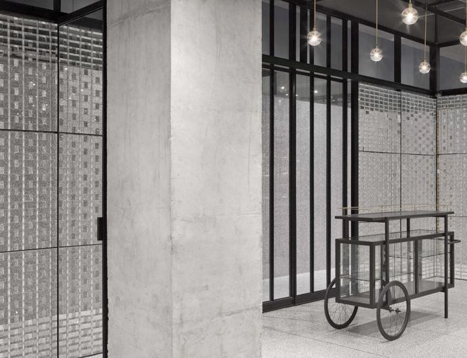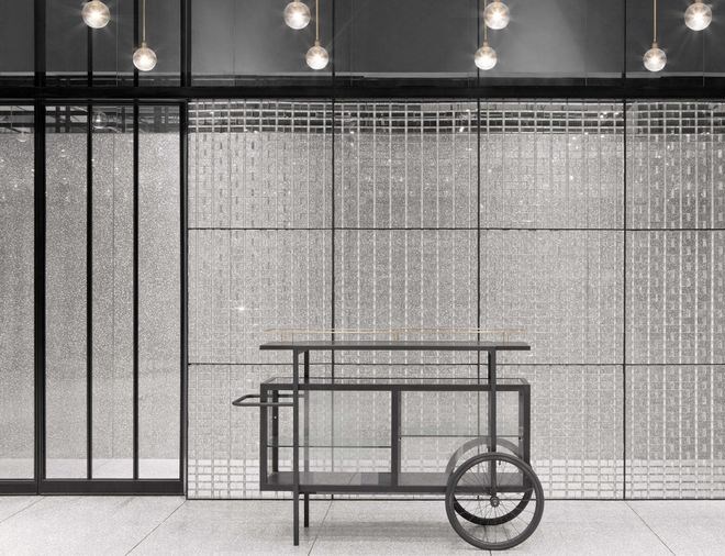從北京隨處可見(jiàn)的灰色磚砌建筑中汲取靈感,玻璃盒子外殼由壓鑄玻璃磚按照傳統(tǒng)方法搭建制成。精心拼接后形成垂直的墻面系統(tǒng)。透明的墻面最大程度地將自然光引入空間內(nèi)部,帶來(lái)明亮而模糊的視野,從一定程度上保護(hù)了空間的私密性。