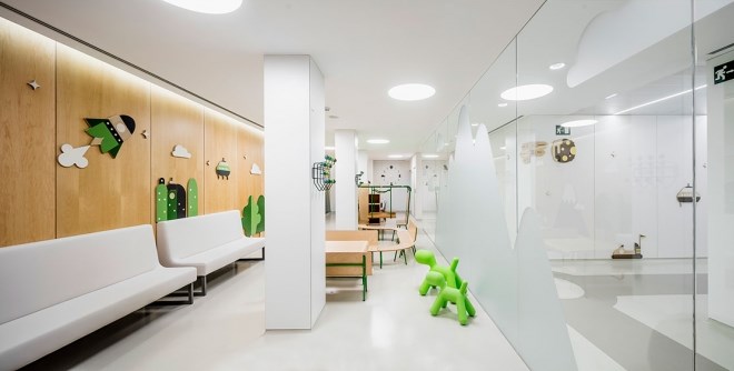 里面有專業的醫療團隊和溫馨的就診環境,不管是病人還是護理人員,都會在這里找到愉悅和舒心。為了達到這一目的,Toormix設計團隊以及合作的Plasencia Arquitectura施工團隊,將這個日常看護中心分為三個區域:等候區、用藥咨詢室、以及治療室。