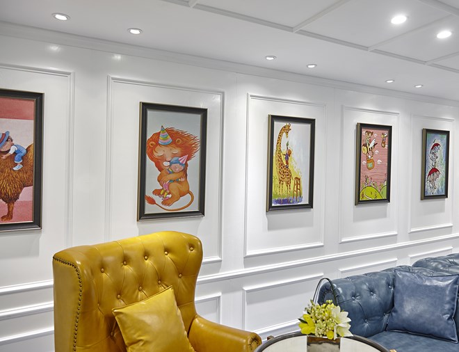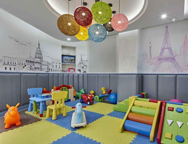 一層強調英倫的雅致及品位,用淺藍色歐式墻面穿插整個空間,強列的空間視角關系,讓客戶流連忘返,記憶深刻,達到商業醫院經營的目的。在本層還很貼心的設立了兒童娛樂區,在兒童娛樂區隨處可見的城堡元素、七彩吊燈、搖搖馬等仿佛讓兒童進到這里就感覺身處游戲城堡之中,大大緩解了就醫前的緊張心情。