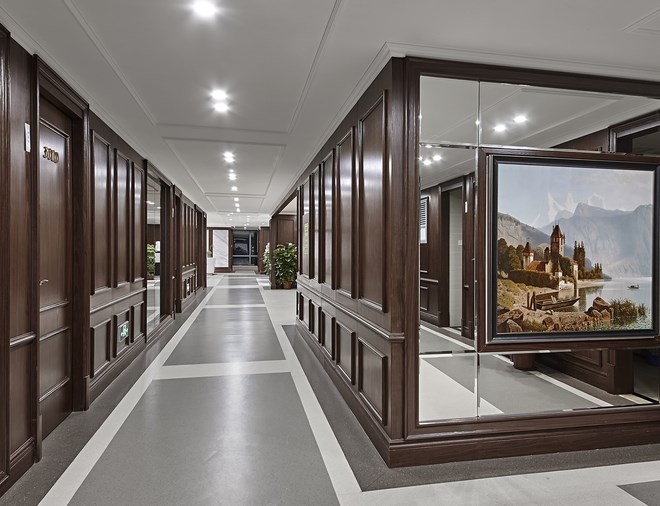 二層用整體白色木飾面墻面做設計構思,在大面積白色調的運用下彰顯清新格調和簡潔大方,極具醫院特色,又不缺味道與個性。曲折蜿蜒的走廊里,鏡面與油畫結合的墻面、大塊玻璃的運用,使得原本枯燥的走廊增添一份空間感。三層VIP客戶層,強調私密與品位,用深色木色系墻面處理整個空間關系,與之定位相關聯。四層手術層,強調空間的溫馨.用暖色調的空間氛圍來削除手術功能帶來的緊張度。