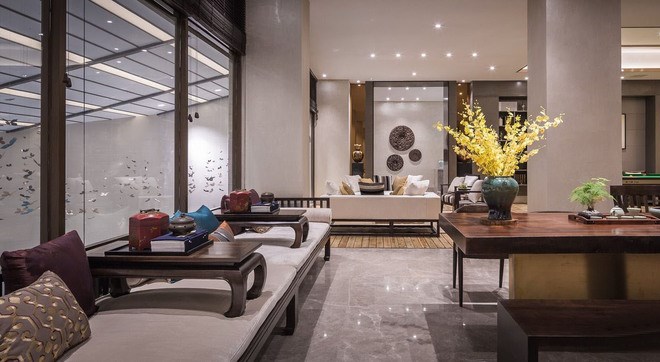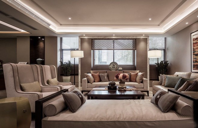 在平面處理上,我們以對景、虛實、疏密、藏露、繁簡等手法串聯各功能空間,一如山靜水動、山陰水陽、山仁水智的陰陽媾和的復合理念,呈現出一派舒適、休閑又兼具品質的山海生活景象。山是精神,亦是境界。在立面上我們用寫意畫的筆觸,輔以深色勾線、淺色帶面,賦予“山”的硬朗。同時,我們在終飾物料及藝術品中亦融入山水肌理和意向,以“水”之陰柔與其和諧相生。