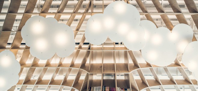 在入口層(上層),曲線的仿木鋁板柔和地升起降落,云片狀的吊燈蜿蜒穿越其中,仿佛庭院綠意被最大程度引入室內后,被提煉形成森林一般自由自在的空間感,社區居民可以在這里卸下面具而放松的交往,這似乎可以看見有如節日的歡快和愉悅。