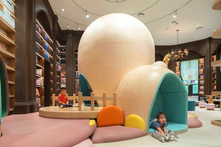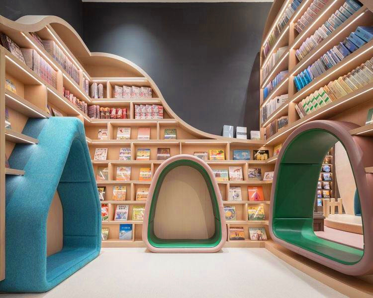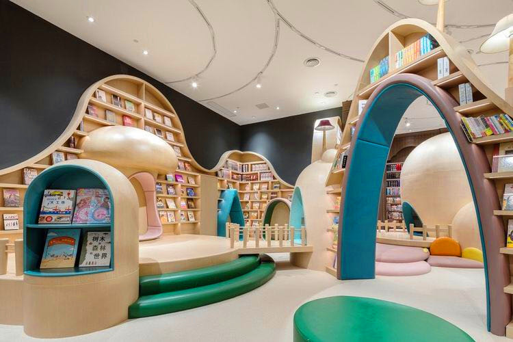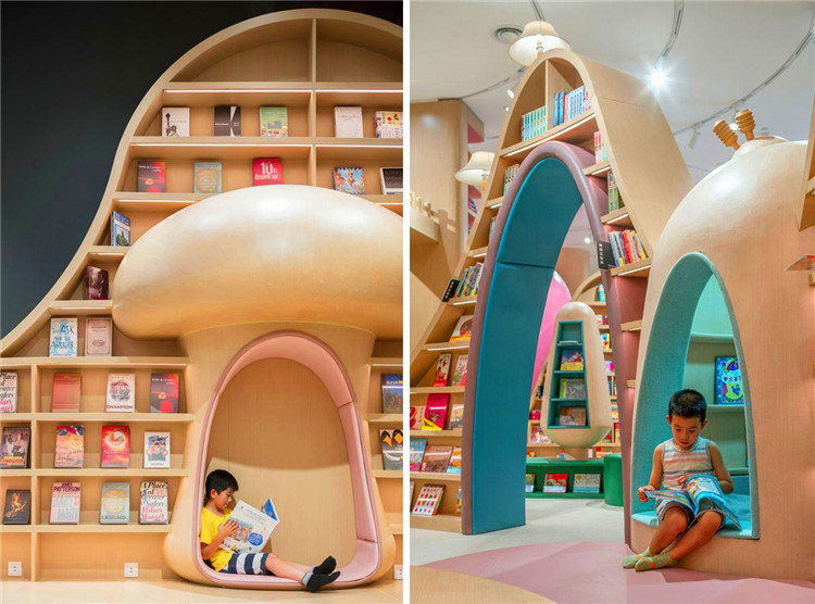 本案設計思路來源與卡通蘑菇屋,用蘑菇的外形輪廓制作書架以及閱讀區座位,給孩子們創造生動活剝活波的就讀空間,整個設計都沒有設置可移動的家具,在書架邊緣以及就坐區均采用軟包處理,以保證孩子在自由閱讀時的安全問題。